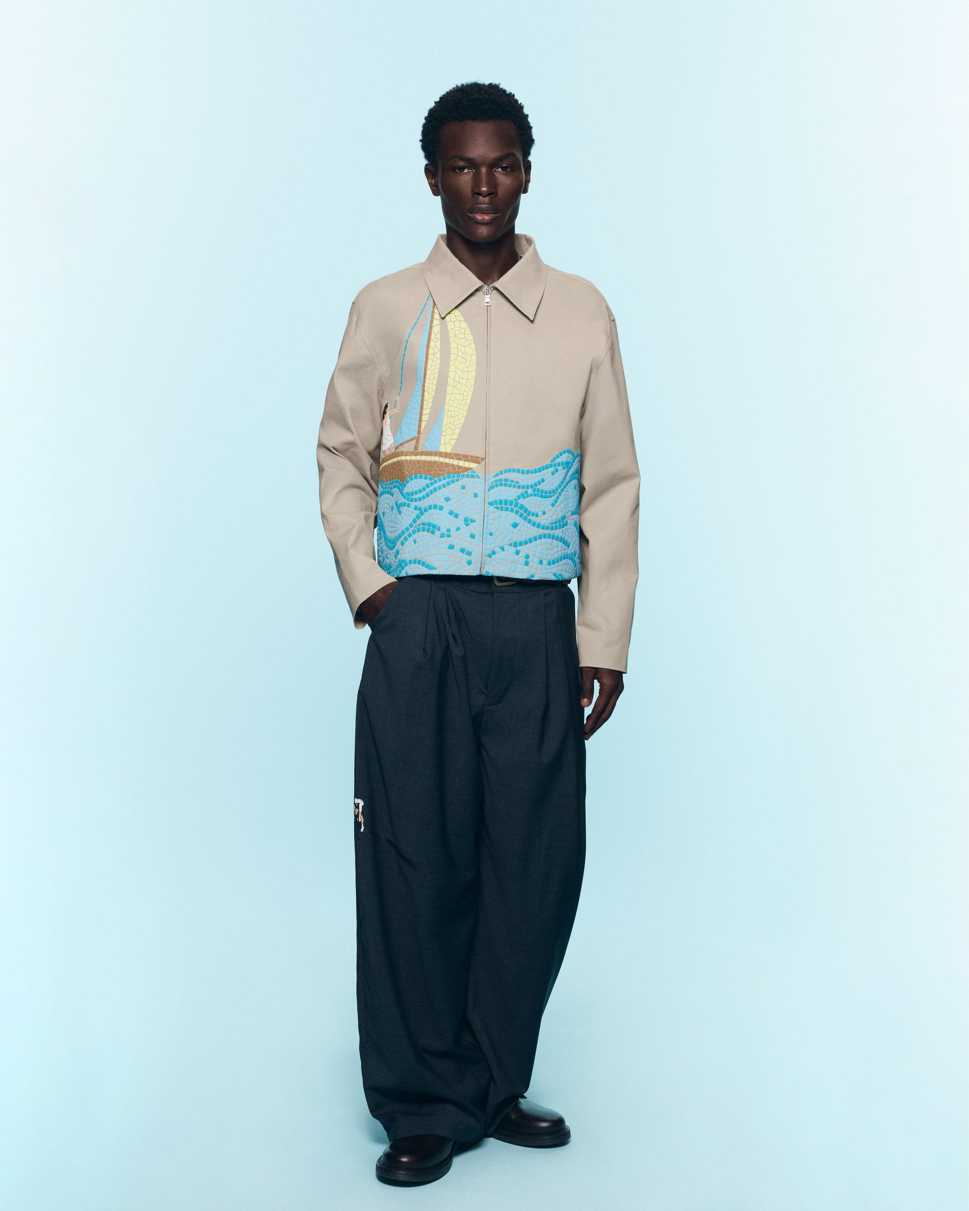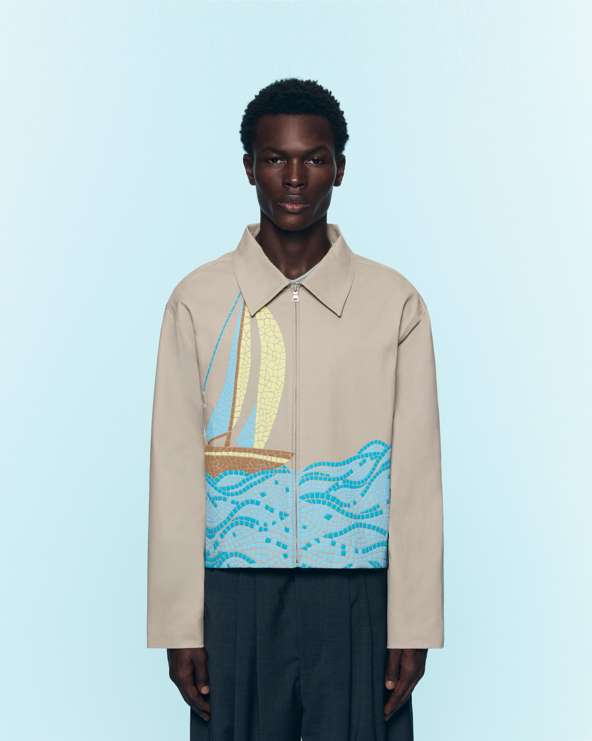 Puff Printed Mosaic Ocean Scene Spans The Front Of The Jacket